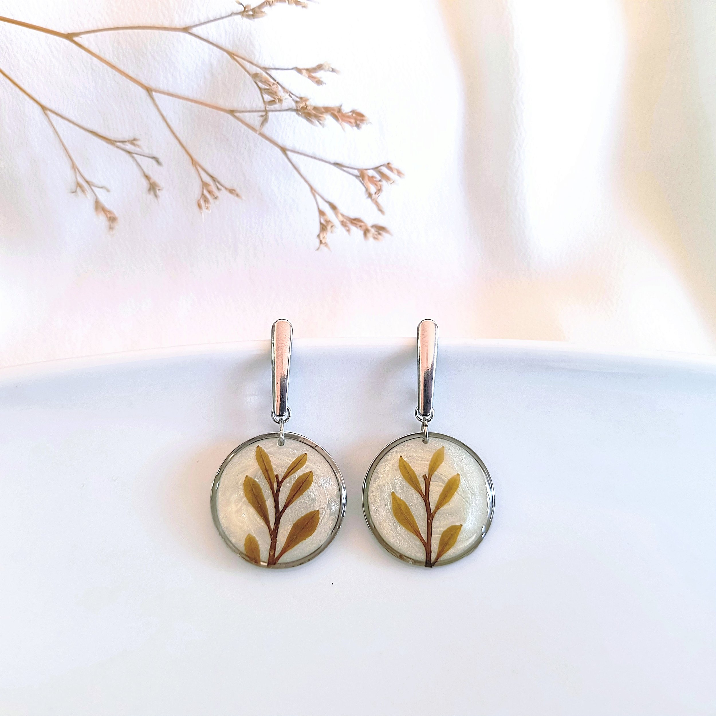 Brincos com raminho de folhas na moldura redonda em aço inox