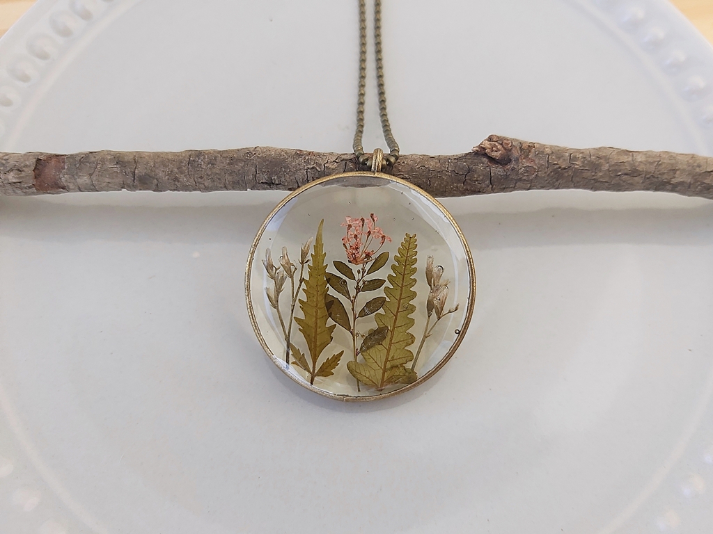 Pingente com moldura redonda em bijuteria (cor ouro velho) com uma varidade de folhas + limoneum e flor de cenoura na cor rosa.